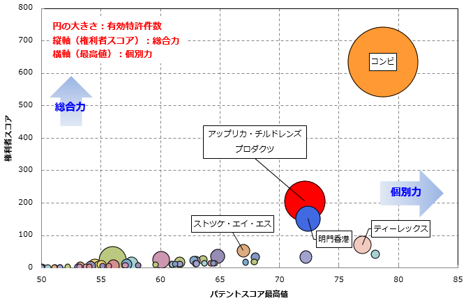 (注1):総合力の評価では、個別特許の注目度を得点化する「パテントスコア」を機関ごとに集計し、パテントスコアが50点以上のものを合算しています。50点以上のものだけを集計している理由は、パテントスコアが低くても特許件数が多いことによって総合力が上がってしまうことを防ぐためです。