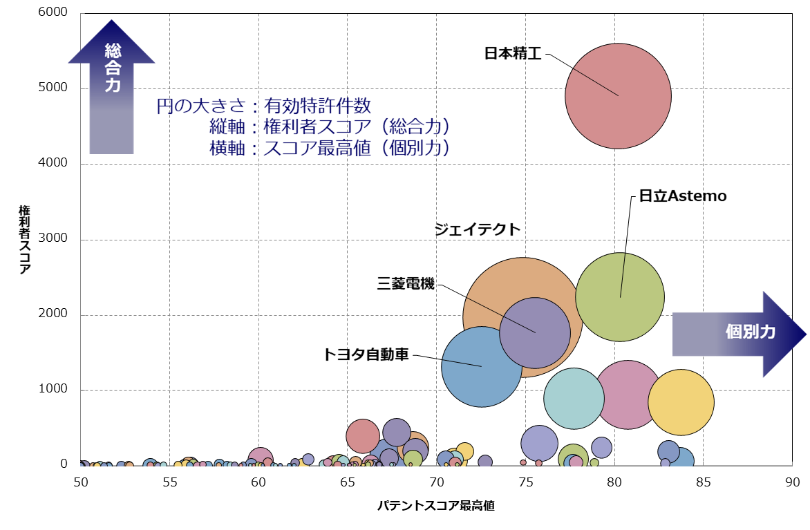 電動パワーステアリングは、ハンドル操作に必要な力を電動で補助し、操舵力を軽くする機構で、基本機能として多くの自動車に搭載されています。今調査では日本の特許庁で公開されている「電動パワーステアリング関連技術」について、個別特許の注目度を得点化する「パテントスコア」をベースに、特許の質と量から総合的に見た評価を行いました。